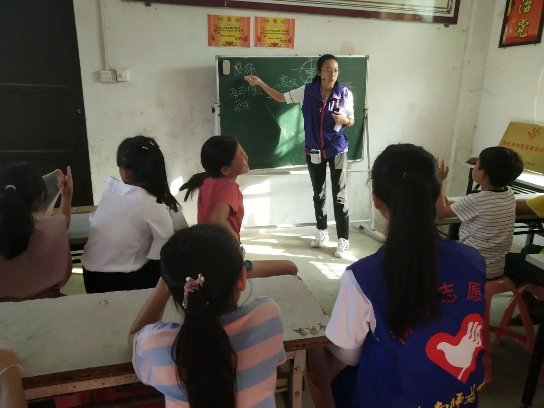 除了参与服务学校师生的志愿活动,齐璐同样积极服务学校周边社区。她曾是文院青协“满天星”志愿服务队的一员。“满天星”服务队主要服务对象是五一社区的儿童,成员们的主要任务就是辅导社区儿童课业、举办一些文体活动丰富孩子们的课外生活。齐璐就曾给孩子们举办过一次“兴趣课堂”,那一节课主要是向跟随父母从全国各地来到海南的孩子们讲述海南的少数民族。“那一天来的小朋友比较少,纪律也不是很好,但每次提问,都会有很多孩子积极地举手回答,看着他们那求知若渴的眼神,那一瞬间,身为教师的幸福感油然而生。”正是秉持着这样一种传播知识的崇高信念,齐璐将自己奉献给了“满天星”,也在奉献中收获了满满的幸福。